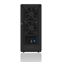 The external JBOD enclosure can accommodate a total of eight SATA I / II / III hard drives or SSDs. It consists largely of aluminium and is therefore stable and dissipates heat very well. The cooling of the drives is achieved due to two temperature controlled 80mm fan on the back and corresponding air-inlets support below the drive bays on the front. The door of the enclosure can be locked.