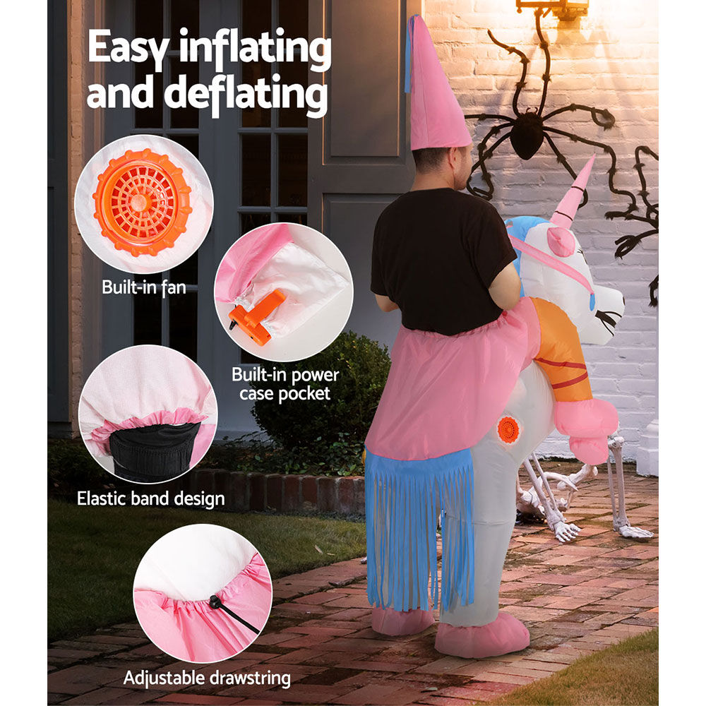 Spook and wow your guests this Halloween with a fun and creative Inflatable Unicorn Costume. With its cartoonish Unicorn design, the costume is guaranteed to delight and impress at your next Halloween party. The costume is made from water-resistant polyester, making it fit to wear come rain or shine. The portable fan system consumes little electricity and can be powered by either 4 x AA batteries or via power bank (batteries and power bank not included). Store your power in the convenient built-in power case. The costume inflates and deflates quickly so you can get the party started without delay. The costume is easy to wear: simply plug in the power, put on the suit then turn on the power and watch the costume inflate in seconds. One size fits most adults. For a winning Halloween costume, you can�t go past our Inflatable Unicorn Costume.