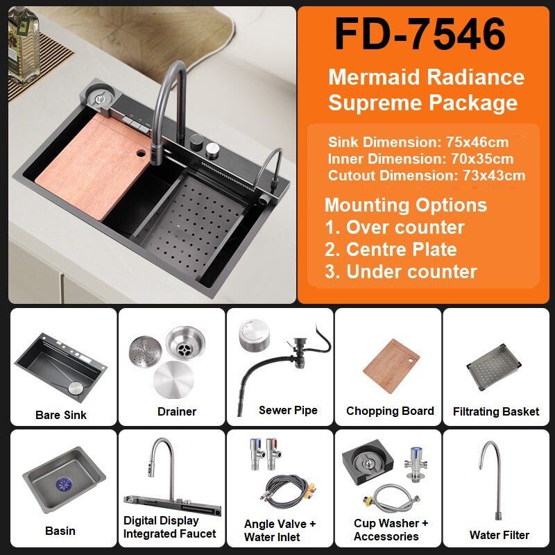 Integrated Waterfall Kitchen Sink Honeycomb Technology Large Digitial Display Stainless Steel Water Filter Cup Washer