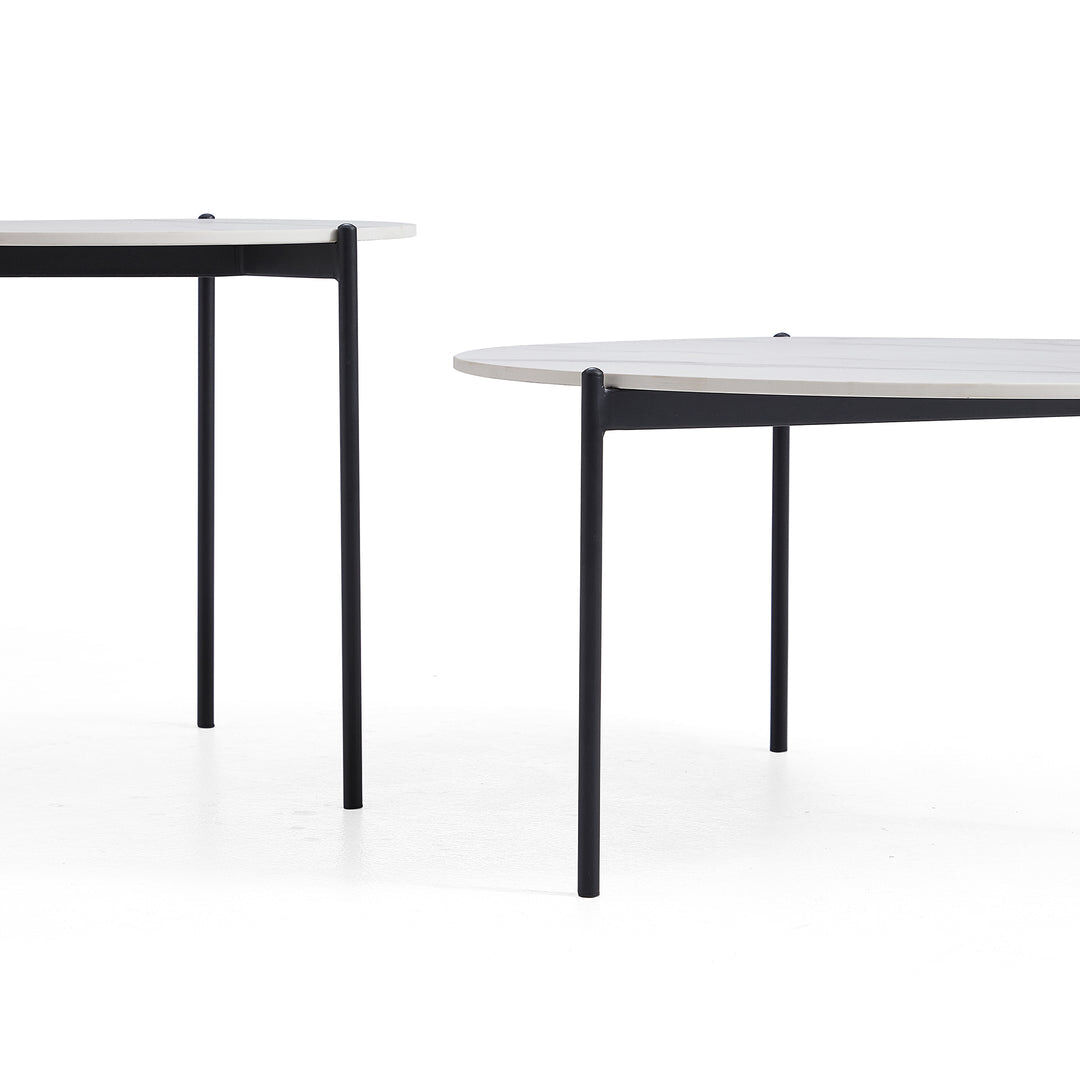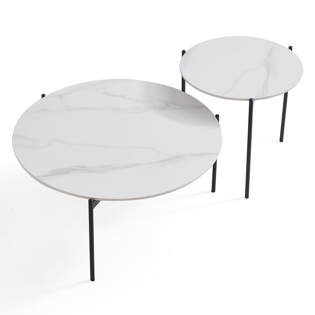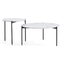Elegance meets simplicity in the Bianco coffee side table set. Sintered stone tops with white stone marble tops, sleek black steel legs. Two versatile tables of varying heights and sizes offer a customisable solution to suit your spatial needs.