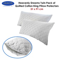 This Twin Pack of Quilted Cotton King Pillow Protectors 51 x 91 cm by Jason will protect your pillows from dust mites and stains while keeping it fresh and prolong its life. It features diamond quilted design, bleached cotton cover with with envelope opening. It is made from quality 100% Cotton fabric and 100gsm polyester filling.