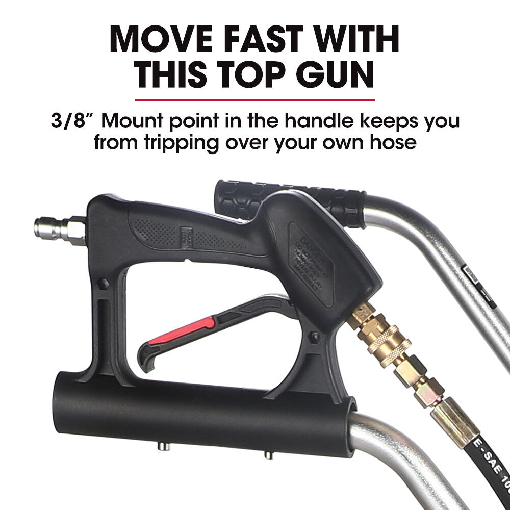 It has a standard ⅜' quick connect fitting for use with most pressure washers. A minimum operating pressure of 2000 PSI @ 11 LPM ensures fast effective cleaning. That means you save water by saving time.