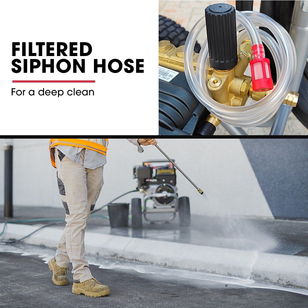 The hose is reinforced with industrial wire braiding and the generous 20 metre length reaches every inch of that roof or long driveway, all whilst maintaining huge pressure to get the job done. With rugged 13x5" oversized no flat wheels and strong yet lightweight balanced tubular frame you can easily work your way around the job site. The frame also features a removable top handle section that ensures that both transport and storage is easy.