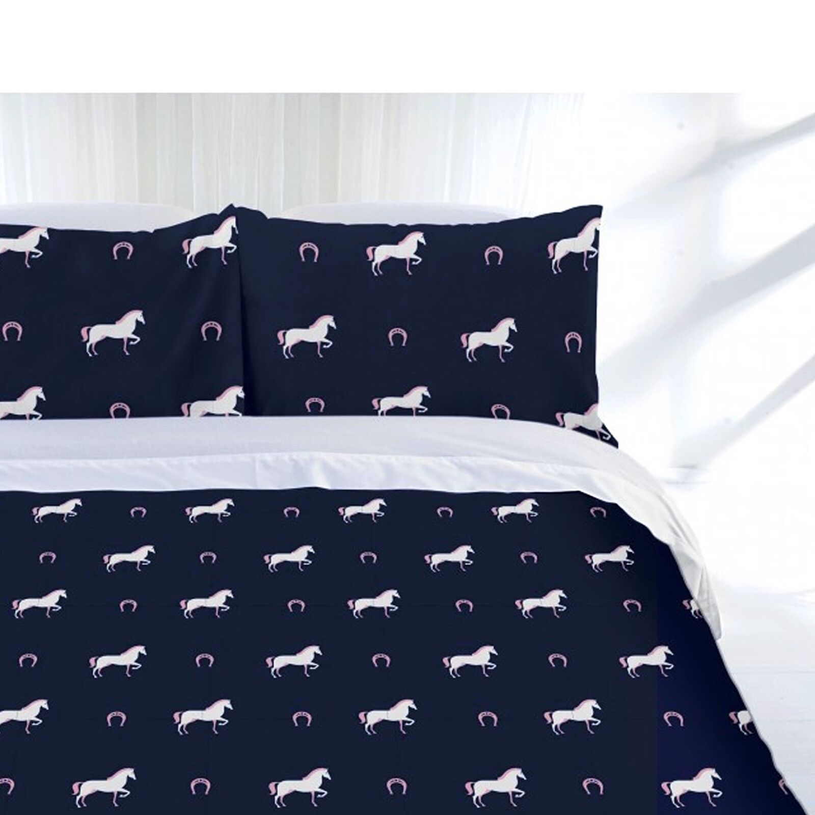 Make a perfect bedroom for your little wrangler with this fun and exciting Horse Shoe Quilt Cover Set by Just Home. The quilt cover features a repeating horse and horseshoe print design in lovely navy, white, and pink colour tones that will brighten any bedroom. It is made from smooth feel Polyester fabric that guarantees quality and comfort.