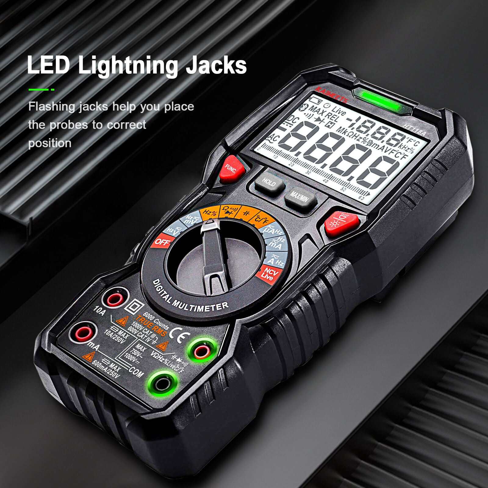 • EASY OPERATION - Switch the dial to the function you need, and the LED lights on the jacks will shine accordingly. To plug in the leads is easy. Autoranging saves you the hassle of having to know which range of value. Large 2.9 LCD backlight display, easy-to-read digits offer a 6000-count resolution.