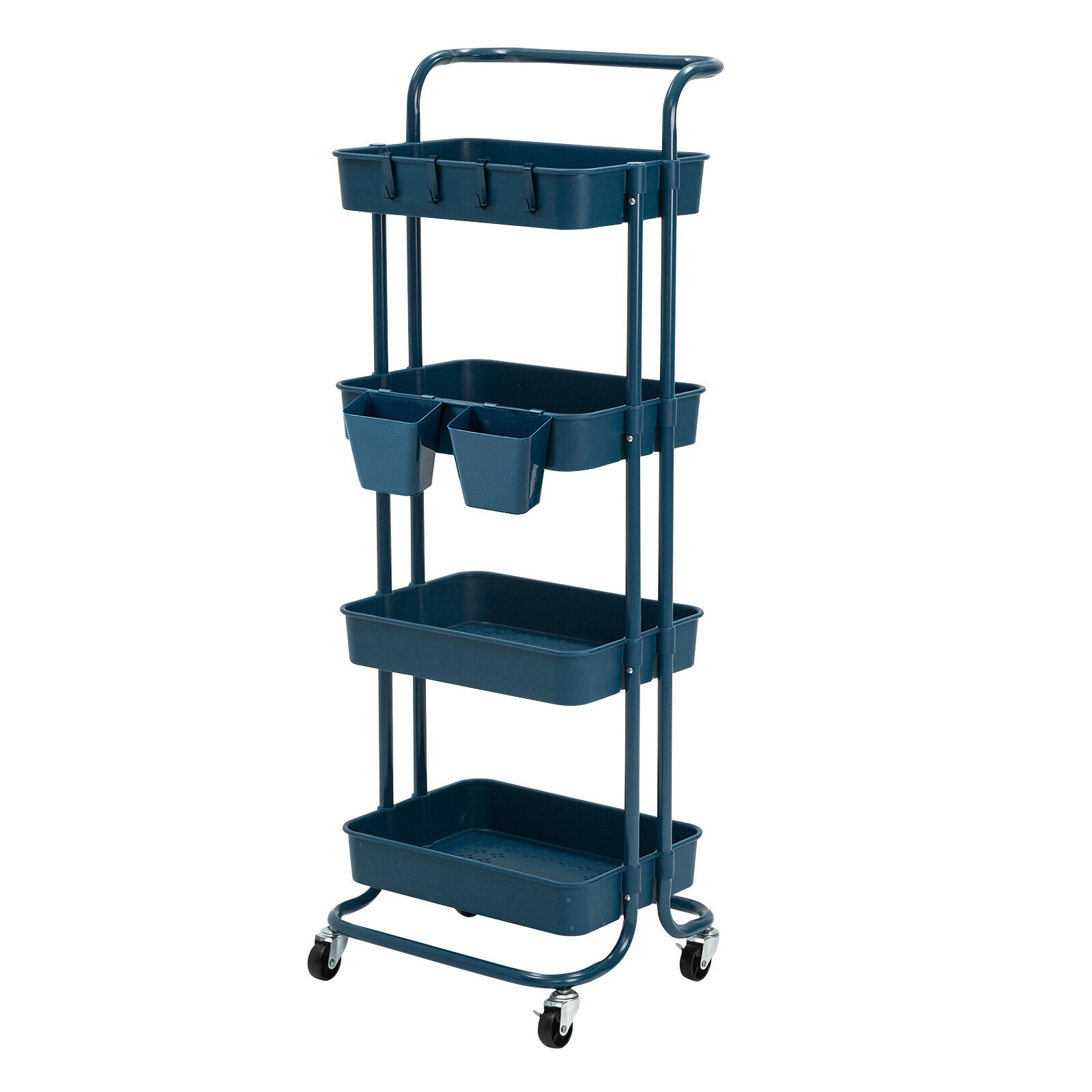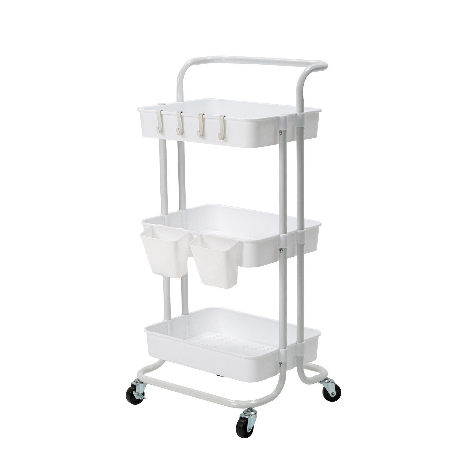Spacious Storage Capacity: Equipped with removable hooks and hanging cups. Partition to store your various objects, neat and clear at a glance. This kitchen utility cart with wheels provides large storage space while saving you floor space to optimize the space utilization as much as possible; great storage solution for a kitchen, or use it for your pantry, office, garage, laundry supplies, toys, stationeries, or any other multitude of possibilities, etc.