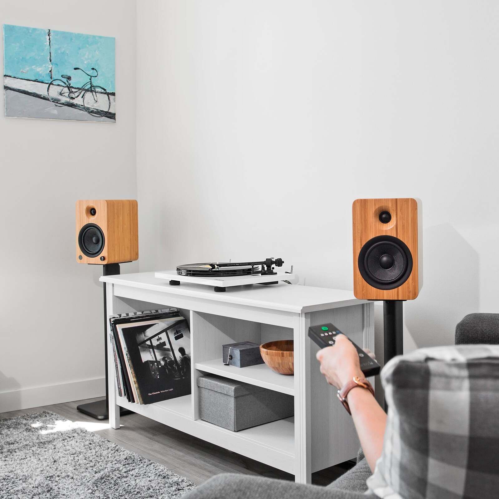 $533.91Kanto YU4 140W Powered Bookshelf Speakers with Bluetooth® and Phono Preamp - Pair, Bamboo - Music is made to be shared. Whether youre hanging out with friends or kicking it solo, YU4 ensures youre always in good company. Producing 140W peak power, its Class D amplifier effortlessly fills your room with rich, spacious sound. Carefully designed 4" Kevlar® drivers and 1" silk dome tweeters faithfully reproduce your favourite tunes, letting you enjoy them to their fullest. Packed with connectivity, YU4 makes it easy to throw on your latest vinyl with a built-in phono preamp, or sit back and stream your carefully curated playlist via Bluetooth®. Crystal-clear, detailed sound for all to enjoy.