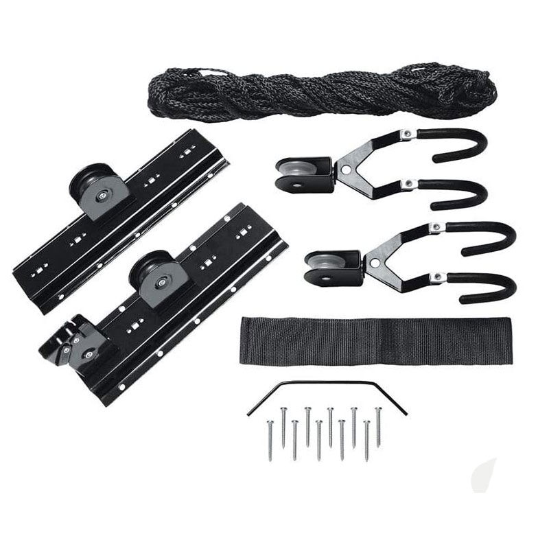 Secure locking mechanism prevents accidental release when suspended. 55kg lifting capacity. Maximum lifting height 3.5m. Includes anchor, 4 x lifting brackets, rope and 10 x fixing screws.