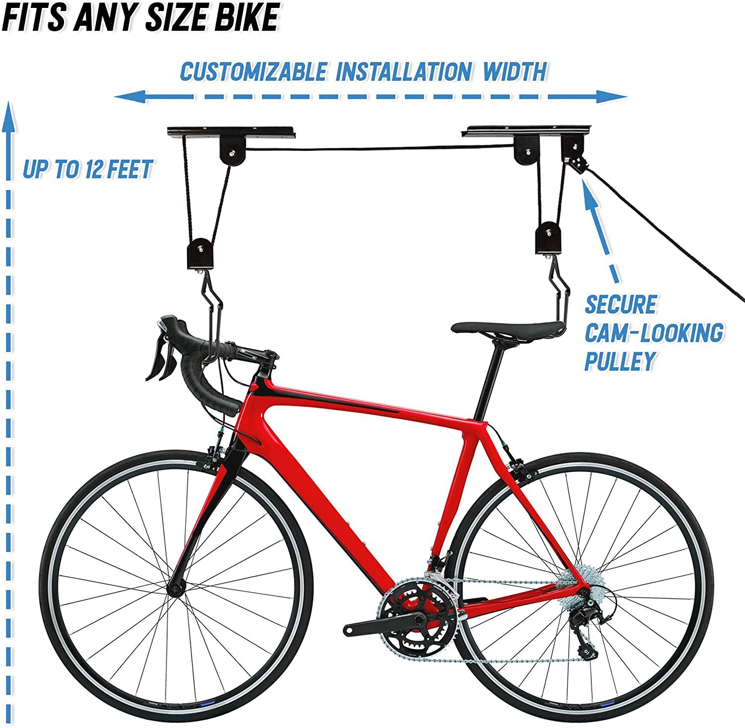 through the 5 pulleys, and the bike can easily be lifted.