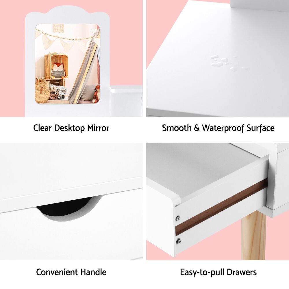 The Keezi Kids Dressing Table Vanity Makeup Chair Set is the perfect addition to any child's room, combining style, functionality, and safety. Crafted with strong pine wood legs for exceptional stability, it features a spacious tabletop and large drawers for ample storage. Designed with smooth, rounded corners and reinforced connections, it ensures safe use for children aged 3 to 7. The set includes a matching vanity makeup chair and a mirror for added charm.