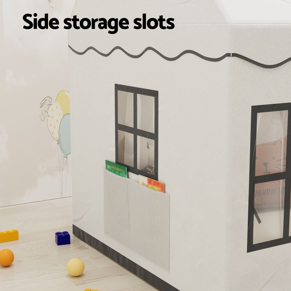 Give your children the gift of creativity and imagination with the Keezi Kids Playhouse! This amazing playhouse provids large space for 3-4 children to play together. Made from durable polyester fabric, the playhouse is designed to last long hours of play both indoors and outdoors. The sturdy PVC poles with firm connections in triangle structure form an ultra stable frame. Besides, the anti-slip mat increases stability and comfort. The door and windows are equipped with breathable mesh curtains which promote good air circulation inside the tent and allow parents to keep an eye on kids conveniently. Meanwhile, the playhouse is designed with 2 side pockets to store kid's toys, story books and other small items. Decorated with a string of shiny star lights, this castle looks much more charming and dreamy, making it a wonderful gift for children and a perfect partner for learning and playing indoors. Easy to store, clean and maintain, you and your kids will love the convenience of the Keezi Kids Playhouse!