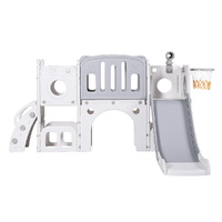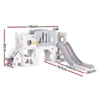 Keep your kids active and entertained with the Keezi 3-in-1 play set. It includes a wide platform, fun telescope, and dual ladder for endless fun. Built from premium HDPE in stylish grey and white, it features anti-slip steps, safe grip handles, and ample bottom space for toy storage. One ball and ring are included for added play. Easy to assemble and ideal for indoor or outdoor use. Note: Kids should be supervised by adults when using the swing.