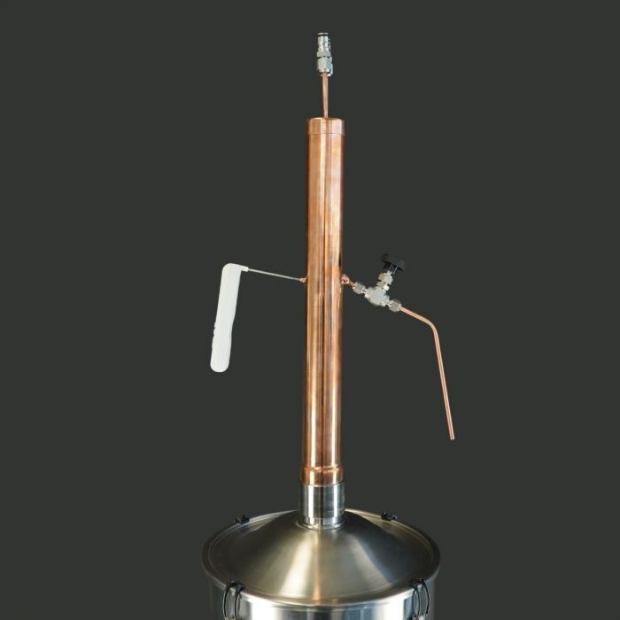 Distillers can use the included ball valve to control the spirit collection flowing from the reflux unit.