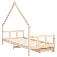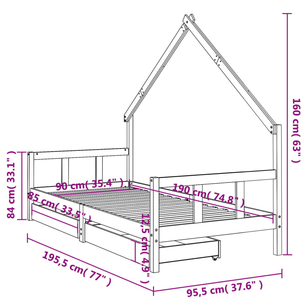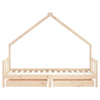 Create a fun-filled space for your little one with this fantastic wooden kids bed frame! Solid pine wood: The kids bed frame is made from solid pine wood. Solid pine wood is a beautiful natural material. Pine wood has a straight grain, and the knots give the material its signature, rustic look.Sturdy slats: The bed for kids has wooden slats for firm support, ventilation and stability.House bed design: This toddler bed featuring a cool yet simplistic design turns bedtime into a fun experience. It offers many possibilities for playing and building your child's little world to stimulate creativity and imagination.Storage drawer: The included storage drawers provide ample space for storing small toys, clothing and bedding, keeping the room tidy and clean.Considerate design: The height of the kids single bed is designed to be low to the ground, making it easy for your child to get in and out of bed.
