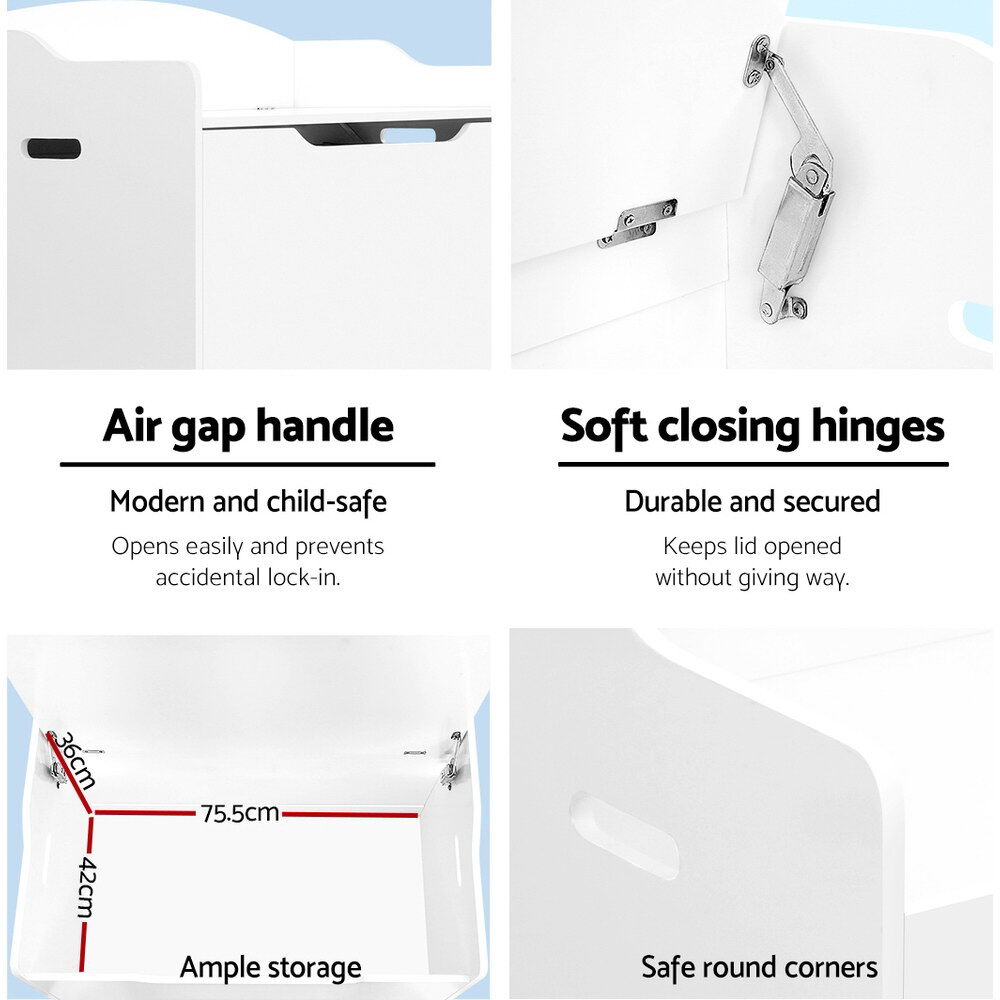 $109.03A bench and a storage box. Our Keezi Kids Storage Bench doubles up wonderfully to let your kids have a fun sitting area to do them do their thing and a neat and tidy storage for their toys, books and a whole lot more. Made of durable 12mm MDF board, the storage bench is strong and sturdy and looks absolutely adorable with its fresh white non-toxic painted finish.