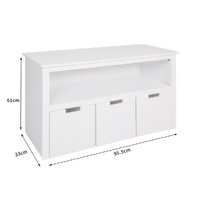 Your playroom storage chest can fit into any room in the house. Living room bedroom kid’s playroom and more. Store toys in the drawers below and books on the shelves.