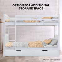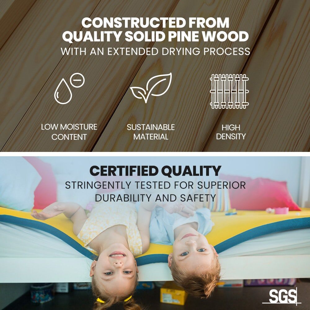 This Kingston Slumber Bed Frame is crafted from solid high-quality sustainably sourced timber and is compatible with standard Australian single sized mattresses. Safety is paramount with SGS-certified quality, rigorously tested for superior durability. The bed features durable plywood slats and a solid, secure ladder. It even features an exclusive toy shelf which is sure to be a nice home for their favourites.