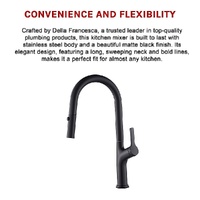 Crafted by Della Francesca, a trusted leader in top-quality plumbing products, this kitchen mixer is built to last with stainless steel body and a beautiful matte black finish. Its elegant design, featuring a long, sweeping neck and bold lines, makes it a perfect fit for almost any kitchen. But it's not just about aestheticsthanks to its flexible neck, the faucet head can be easily pulled out for added convenience and flexibility while tackling dishes and other chores. Switching back to a traditional mixer is a breeze too.