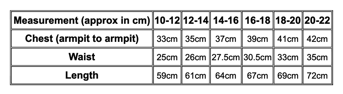 Measurement (approx in cm) 10-12 12-14 14-16 16-18 18-20 20-22