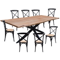 Enjoy meals with your family on this beautifully assorted dining set and start creating wonderful dining moments. The gorgeous dining table in the set is designed in the industrial style. The table looks exceptionally lovely as it is made of sustainably harvested Solid Acacia timber with natural grain patterns. The Live edge tabletop in its organic form celebrates the natural grain patterns inherent in Acacia timber, giving the table a natural beauty. The tabletop is solid 38mm thick. Painted in a natural finish, the tabletop is paired with black steel legs in a cross design. The elegant 10-seater dining table has a one-of-a-kind design with a tabletop and legs in different colours and styles. The exceptionally beautiful dining chairs, designed in the traditional style, complement the stunning dining set. These are beautiful, multi-colour chairs with comfortable back and hip support. They have a cross back and Rattan cushion seat in a lovely light grey colour.The chairs are crafted from high-quality Birch timber and a rattan seat pad, making them strong, long-lasting, and comfortable. The wood makes the chair surfaces super strong and also resistant to moisture. The sleek designed dining set looks great in your living room. Only the dining table needs to be assembled in the entire set, and it comes with a one-year warranty.