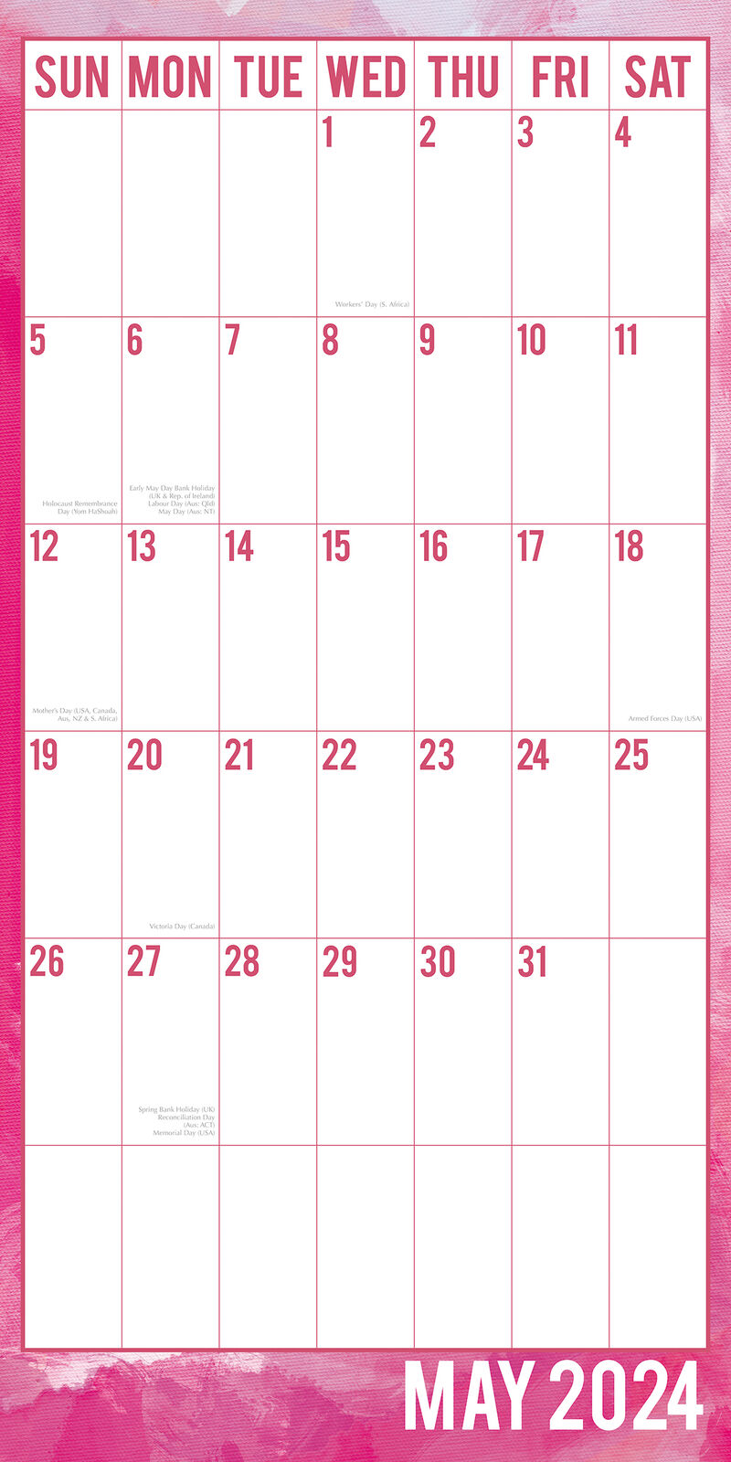 • Public Holidays and major religious dates are marked for Australia, New Zealand, UK, USA, Canada, Japan, and South Africa