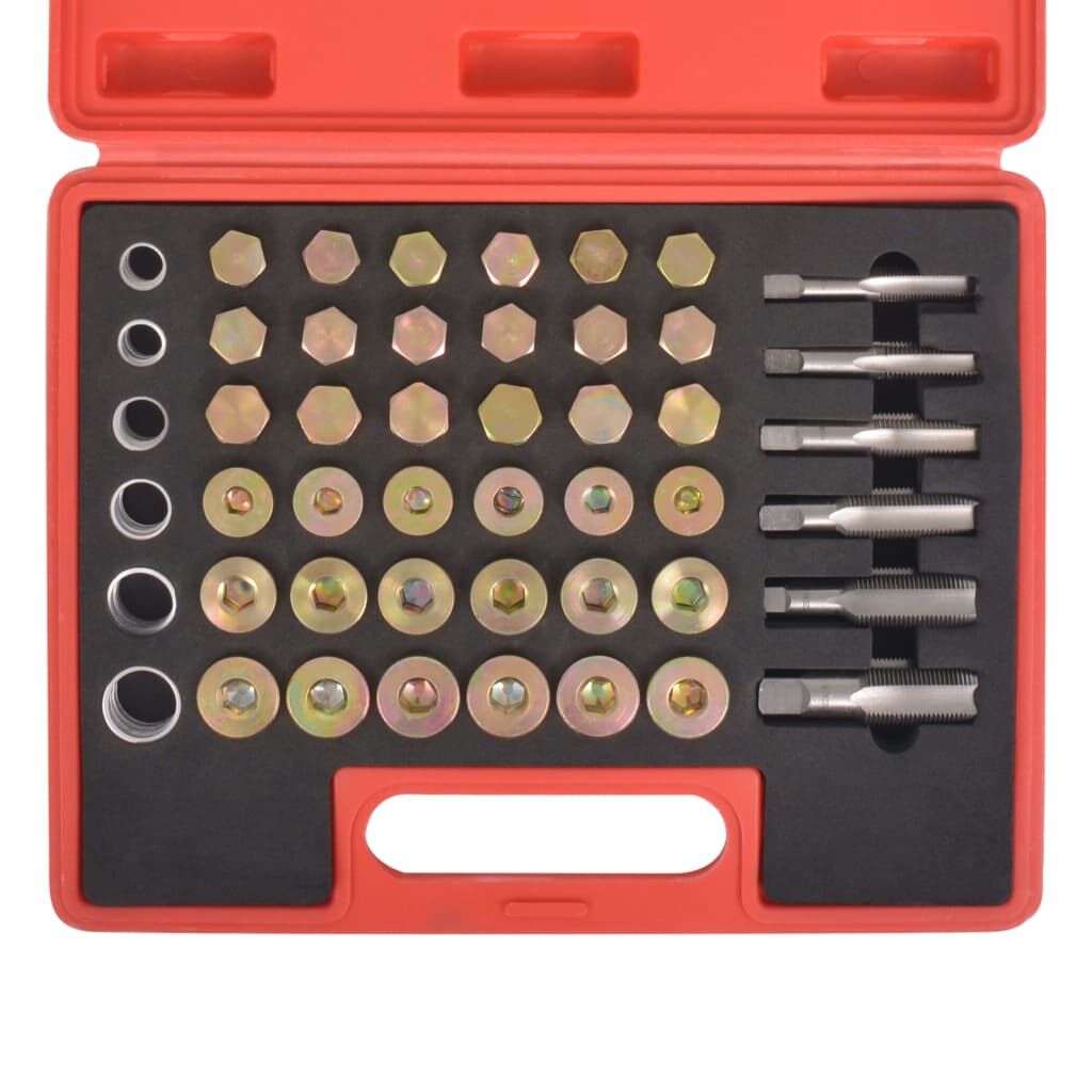 This comprehensive oil drain plug thread repair kit of six-size taps, oil drain plugs and washers fits nearly all applications. It is ideal for repairing sump, gearbox and differential plug threads. This kit provides new enlarged thread and replacement drain plug screws for use when existing threads are damaged or worn away. It is suitable for most threads used on cars and light commercial vehicles such as Audi, VW, BMW, Citroen, Fiat, Ford, Seat, Honda, Mazda, Mitsubishi, Opel, Peugeot, Renault, Toyota and Volvo.Made of high quality materials, the kit is designed for long life in daily workshop use. All tools are supplied in a blow mold case for easy storage and transportation.