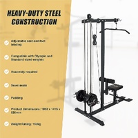 This new Fitness Plate Loaded Low Row / Lat Pull has a heavy duty steel construction. The solid unit has a dual guide rod system which provides the ultimate in safe, smooth and easy range of motion. The foot plate can be quickly flipped up in place for low rows. Lat Pull Down, Straight Row Bar and Standard and Olympic Weight Plate Adapters are included. Its no cable change design allows for easy adjustment from lat pull down to low rows.