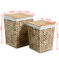 The laundry basket set consists of 2 hampers in different sizes and will make a great addition to your bathroom. The laundry baskets are made of water hyacinth with a strong metal frame, which makes them sturdy and durable. The attractive woven style adds to the baskets' rustic charm. The fabric liners are removable and washable. Delivery includes 2 laundry bins in different sizes.