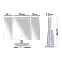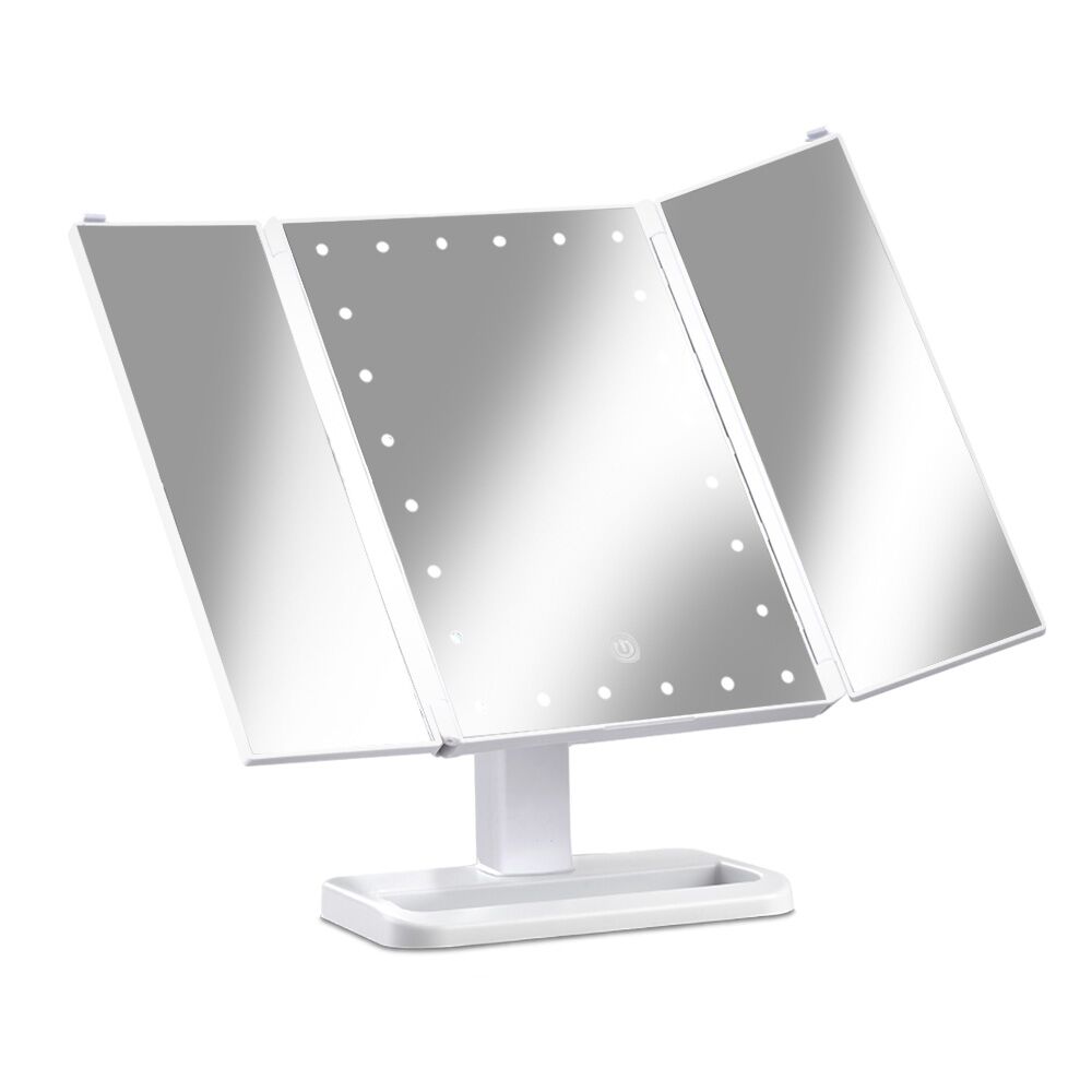 Our LED makeup mirror features 22 high-quality LED lights evenly placed around the hgih-defintion mirror. A smart touch control manages the power and adjustments for lighting brightness and colour. The tri-fold design allows wide angle viewing and the mirror can be swiveled 180 degrees and fixed in any position. The mirror can be powered by four AA-sized batteries or through the supplied USB cable. A detachable storage tray is also included.