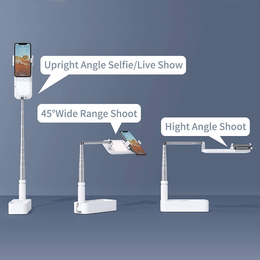 -Adjustable 360 Rotate: Height adjustable up to 130cm used as a floor stand or desktop selfie stand occasions. 360 rotate phone clamp and light board, easy to switch between different angles to match your shooting angle needs . The joint of the front holder is 90 bendable which supports overhead recording.