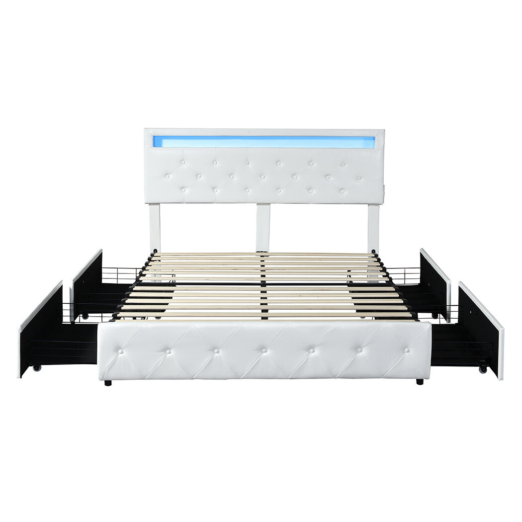 Set up your queen bed frame. Plug the power cord in. Grab the remote or control the LED lights via your phone. Time for some mood lighting. Get bored. Charge your phone via the USB port.