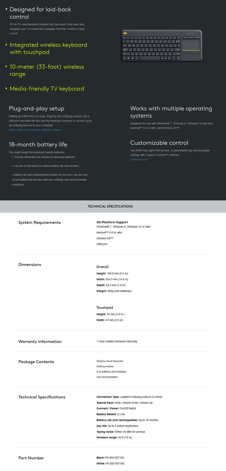 1 x 920-007165: Logitech K400 PLUS Touch Wireless keyboard - Black