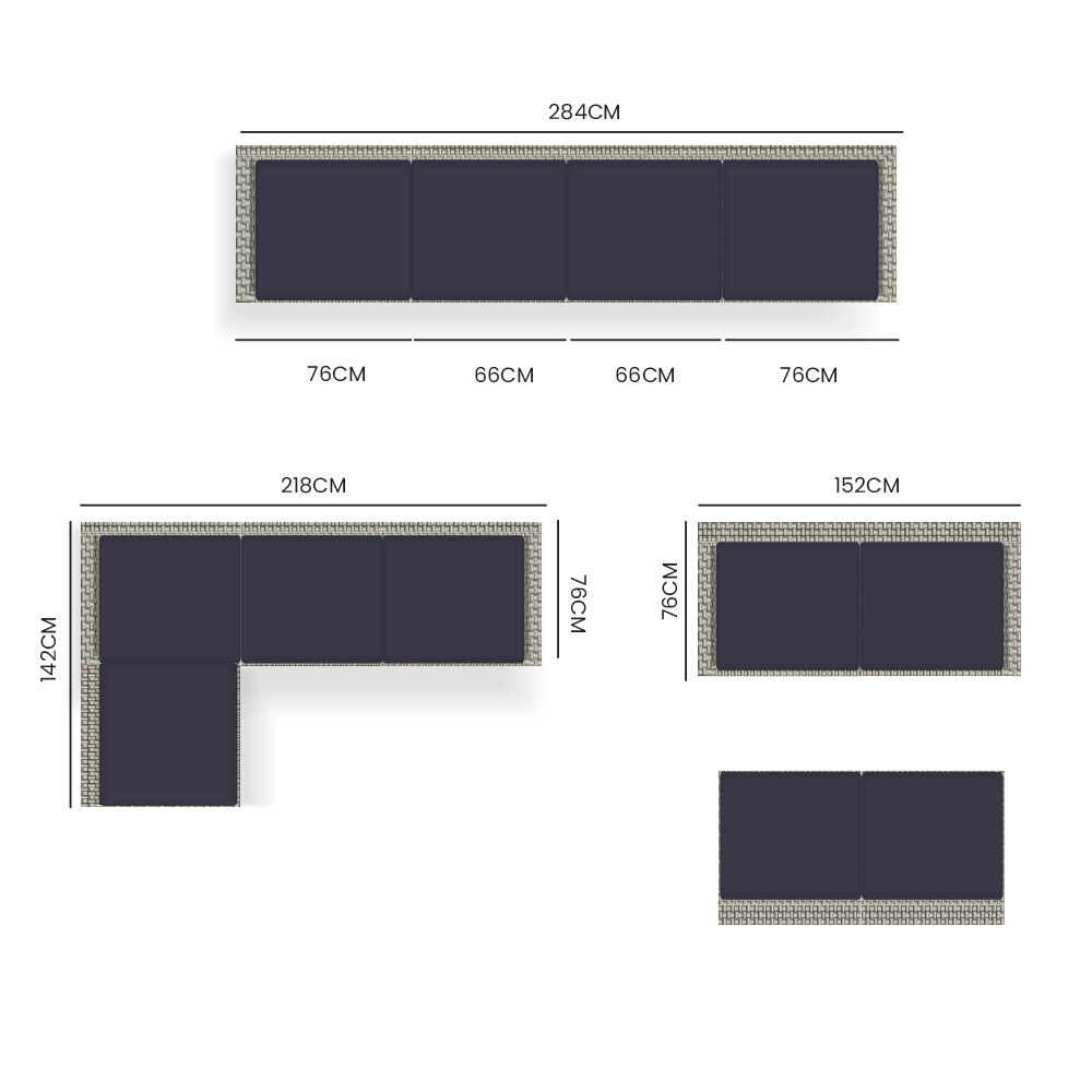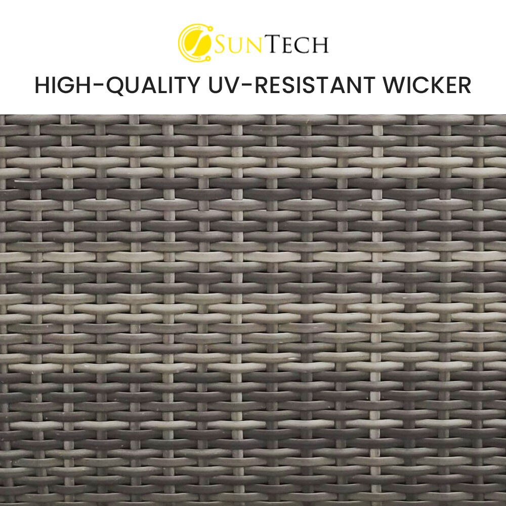 The set includes ultra-comfy 8cm thick water-resistant seat cushions, generous backrest cushioning and two throw cushions. The high-quality UV-resistant handwoven Suntech wicker in Marl Grey weave has a premium natural textured look. With a modular design comprising two sofas and two corner sofas, you can set it up in whatever configuration works best for you, making this London Rattan outdoor lounge setting a great addition to any outdoor space.