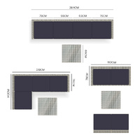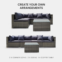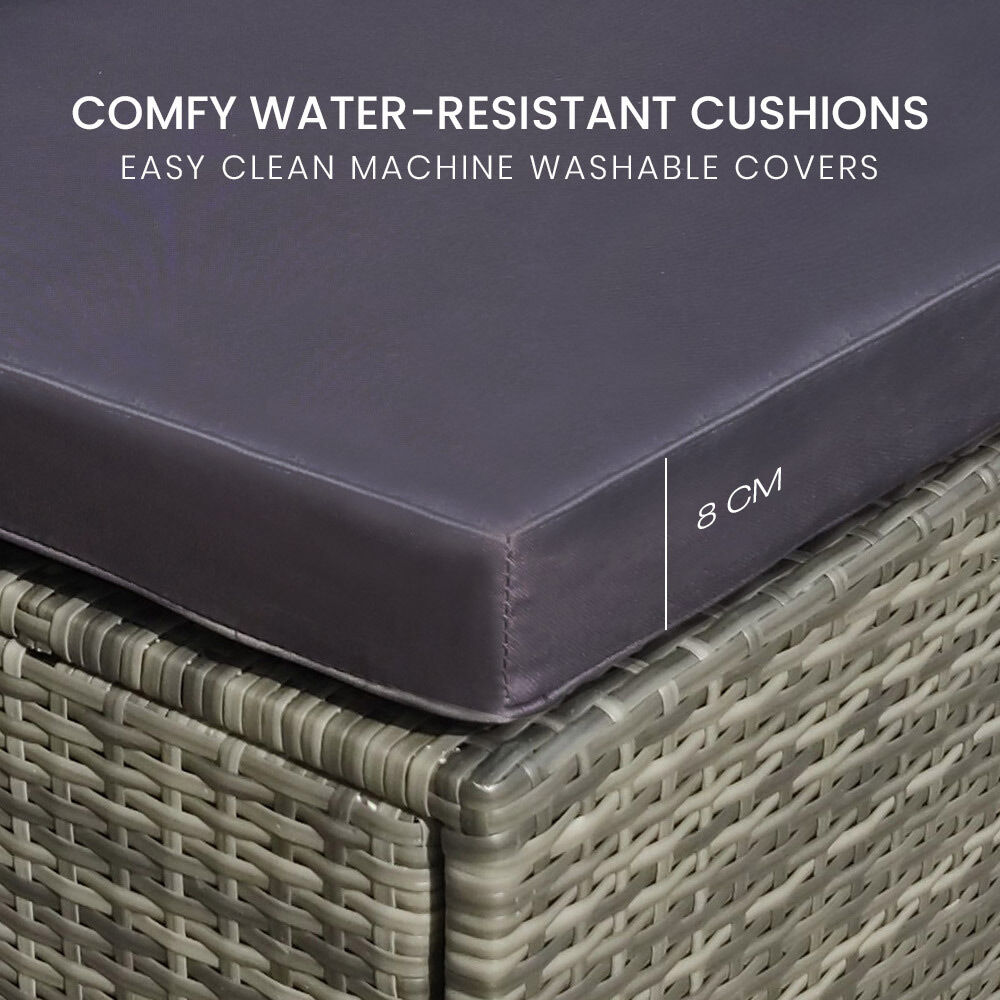 The set includes ultra-comfy 8cm thick water-resistant seat cushions, generous backrest cushioning and two throw cushions. The high-quality UV-resistant handwoven Suntech wicker in Marl Grey weave has a premium natural textured look. This a modular design comprising 2 sofas, two corner sofas, plus a coffee table with tempered glass table top. You can set it up in whatever configuration works best for you, making this London Rattan outdoor lounge setting a great addition to any outdoor space.