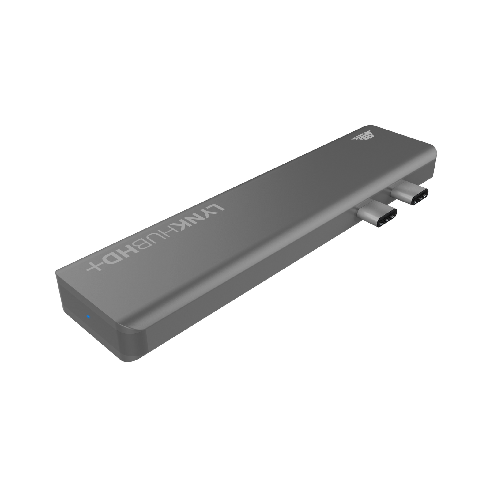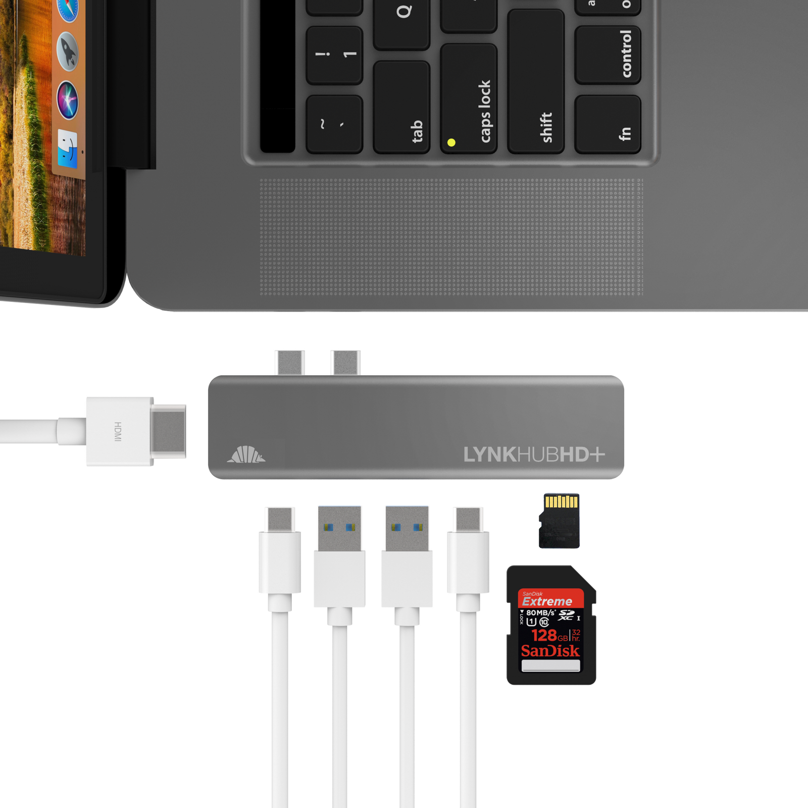 TheLynkHUB HD+ is a 7-in-1 adapterthat connects to all of the ports you need! With multiple USB ports, a SD and MicroSD slot, and HDMI connection, you\'ll be able to connect tons of devices to your laptop. The available ports in the lynkHUB HD+ are as follows: USB C, two USB ports, SD Card Reader, MicroSD Card Reader, and a HDMI port.