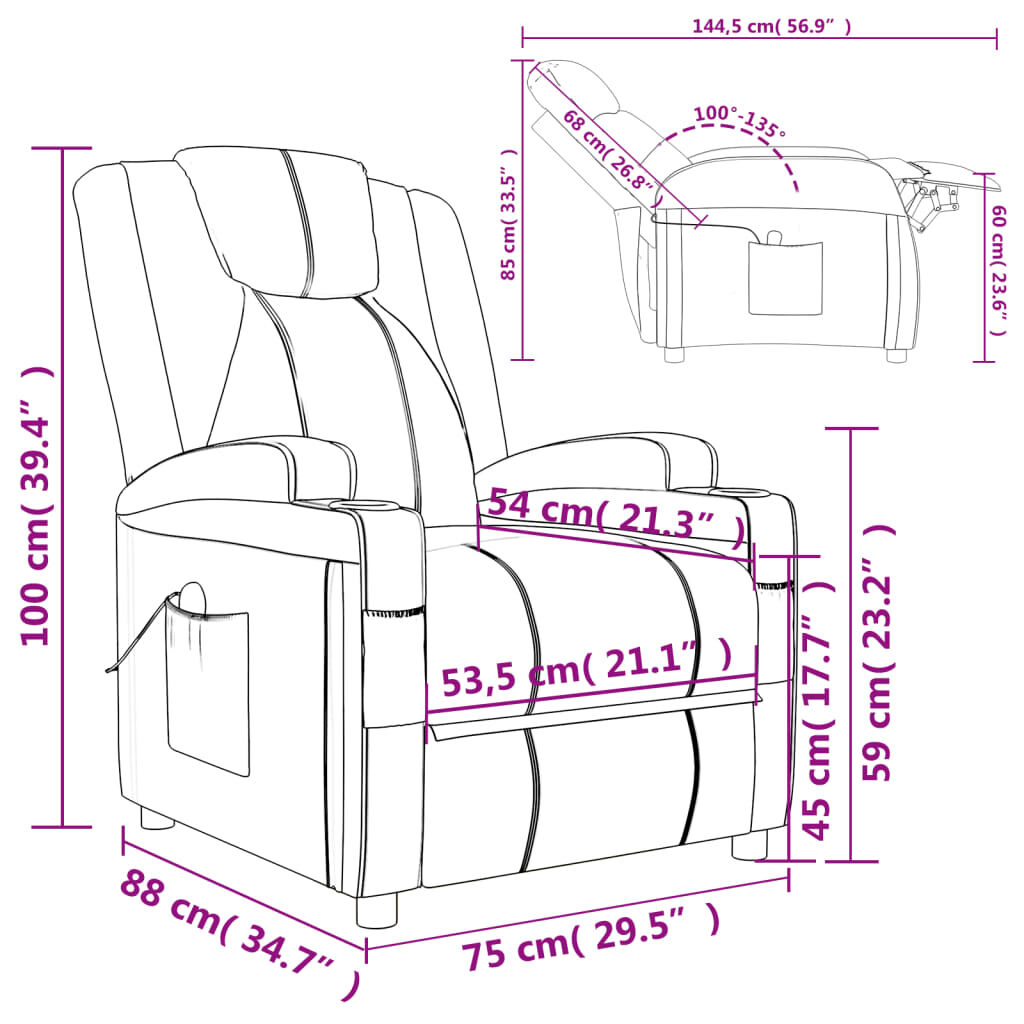 Sit back and drift away in this highly comfortable massage chair! Manual reclining function: The reclining chair is specially designed with 3 reclining positions so that you can adjust the backrest and footrest manually as per your comfort.Vibration function: The featured 6 massage points let you experience a better-targeted massage. Additionally, the included hand control allows you to pick different massage programs. The massage function is powered by the USB connector, but the certified 5V USB power source is not included.Comfortable seat experience: The thickly padded seat, backrest, and wide armrests covered in faux leather provide a cosy and warm sensation, making you feel embraced while seated. The faux leather is a highly durable material. It is resistant to stain, making it easy to clean with a damp cloth. The smooth surface also gives a luxurious look and the beauty of real leather.Solid and stable frame: The frame made of wood and metal provides a strong structure and stability. This reclining armchair is comfortable and durable.