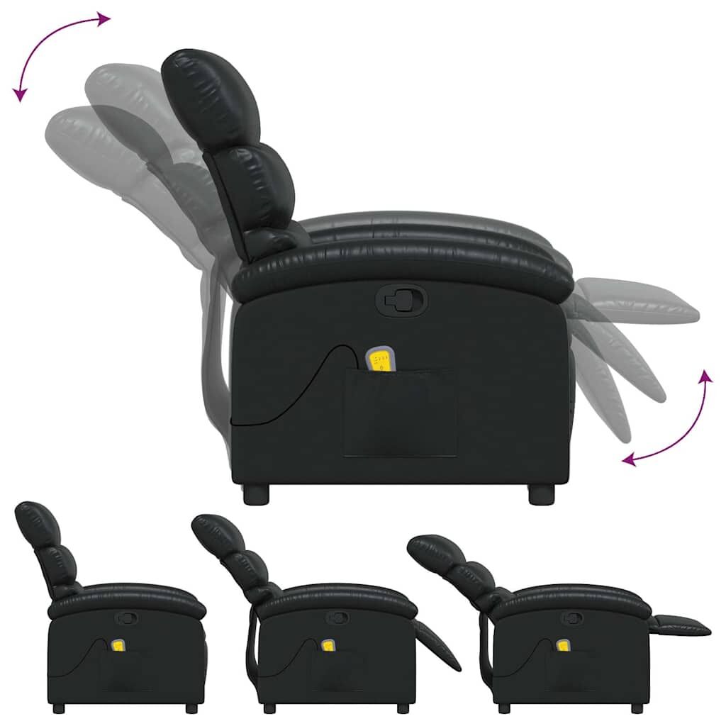 Sit back and drift away in this highly comfortable massage recliner chair! Manual reclining function: This reclining chair has a handle on the right side. You can manually adjust the footrest and the backrest to any position as per your comfort with a simple pull of the handle. This feature allows for a maximum tilt of 135 degrees. Additionally, the backrest can go quickly back to the original place with an easy pull of the handle.Vibration function: The featured 6 massage points let you experience a better-targeted massage. Additionally, the included hand control allows you to pick different massage programs. The massage function is powered by the USB connector, but the certified 5V USB power source is not included.Comfortable seat experience: The thickly padded seat, backrest, and wide armrests covered in faux leather provide a cosy sensation, making you feel embraced while seated. The faux leather is a highly durable material. It is resistant to stain, making it easy to clean with a damp cloth. The smooth surface also gives a luxurious look and the beauty of real leather.Convenient side pocket: This armchair has a side pocket for your remote control or keeping your essential items within easy reach.Solid and stable frame: The frame made of wood and metal provides a strong structure and stability. This reclining armchair is comfortable and durable.