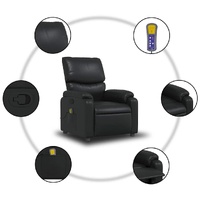 Sit back and drift away in this highly comfortable massage recliner chair! Manual reclining function: This reclining chair has a handle on the right side. You can manually adjust the footrest and the backrest to any position as per your comfort with a simple pull of the handle. This feature allows for a maximum tilt of 135 degrees. Additionally, the backrest can go quickly back to the original place with an easy pull of the handle.Vibration function: The featured 6 massage points let you experience a better-targeted massage. Additionally, the included hand control allows you to pick different massage programs. The massage function is powered by the USB connector, but the certified 5V USB power source is not included.Comfortable seat experience: The thickly padded seat, backrest, and wide armrests covered in faux leather provide a cosy sensation, making you feel embraced while seated. The faux leather is a highly durable material. It is resistant to stain, making it easy to clean with a damp cloth. The smooth surface also gives a luxurious look and the beauty of real leather.Convenient side pocket: This armchair has a side pocket for your remote control or keeping your essential items within easy reach.Solid and stable frame: The frame made of wood and metal provides a strong structure and stability. This reclining armchair is comfortable and durable.