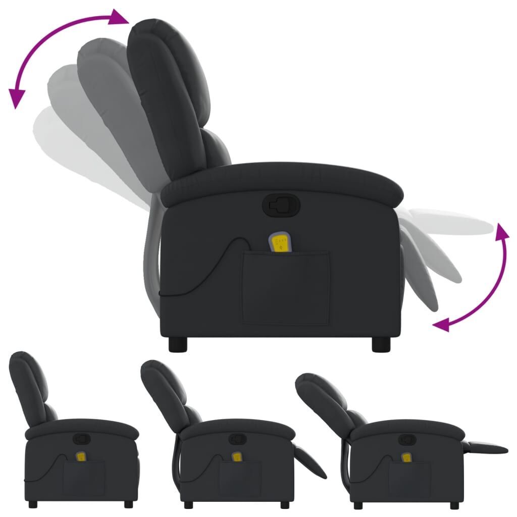 Sit back and drift away in this highly comfortable massage recliner chair! Manual reclining function: This reclining chair has a button on the right side. You can manually adjust the footrest and the backrest to any position as per your comfort with a simple pull of the handle. This feature allows for a maximum tilt of 135 degrees. Additionally, the backrest can go quickly back to the original place with an easy pull of the handle.Vibration function: The featured 6 massage points let you experience a better-targeted massage. Additionally, the included hand control allows you to pick different massage programs. The massage function is powered by the USB connector, but the certified 5V USB power source is not included.Comfortable seat experience: The thickly padded seat, backrest, and wide armrests covered in real leather provide a cosy sensation, making you feel embraced while seated. Real leather is a naturally timeless material. It can last a lifetime with proper care and maintenance. The smooth surface also gives it a stylish look while ensuring optimal comfort.Convenient side pocket: This armchair has a side pocket for your remote control or keeping your essential items within easy reach.Solid and stable frame: The frame made of wood and metal provides a strong structure and stability. This reclining armchair is comfortable and durable.
