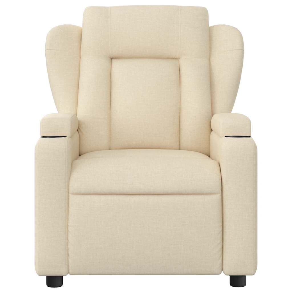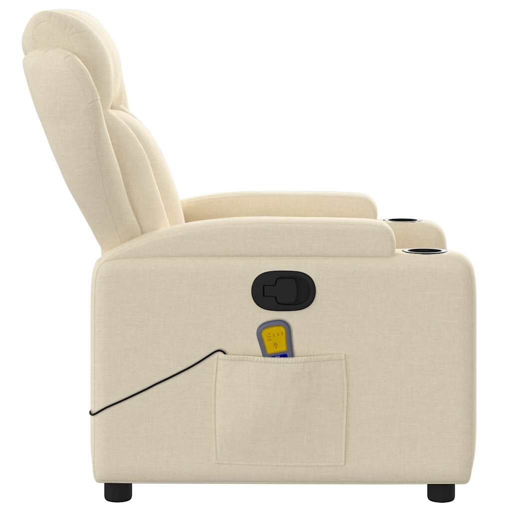 Sit back and drift away in this highly comfortable massage recliner chair! Manual reclining function: This reclining chair has a handle on the right side. You can manually adjust the footrest and the backrest to any position as per your comfort with a simple pull of the handle. This feature allows for a maximum tilt of 135 degrees. Additionally, the backrest can go quickly back to the original place with an easy pull of the handle.Vibration function: The featured 6 massage points let you experience a better-targeted massage. Additionally, the included hand control allows you to pick different massage programs. The massage function is powered by the USB connector, but the certified 5V USB power source is not included.Comfortable seat experience: The thickly padded seat, backrest, and wide armrests covered in fabric provide a cosy and warm sensation, making you feel embraced while seated. The fabric features a simple and clean look and is breathable and durable.Convenient cup holders and side pocket: This armchair has two convenient cup holders for your drinks and a side pocket for your remote control or keeping your essential items within easy reach.Solid and stable frame: The frame made of wood and metal provides a strong structure and stability. This reclining armchair is comfortable and durable.