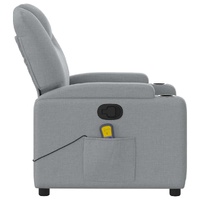 Sit back and drift away in this highly comfortable massage recliner chair! Manual reclining function: This reclining chair has a button on the right side. You can manually adjust the footrest and the backrest to any position as per your comfort with a simple pull of the handle. This feature allows for a maximum tilt of 135 degrees. Additionally, the backrest can go quickly back to the original place with an easy pull of the handle.Vibration function: The featured 6 massage points let you experience a better-targeted massage. Additionally, the included hand control allows you to pick different massage programs. The massage function is powered by the USB connector, but the certified 5V USB power source is not included.Comfortable seat experience: The thickly padded seat, backrest, and wide armrests covered in fabric provide a cosy and warm sensation, making you feel embraced while seated. The fabric features a simple and clean look and is breathable and durable.Convenient cup holders and side pocket: This armchair has two convenient cup holders for your drinks and a side pocket for your remote control or keeping your essential items within easy reach.Solid and stable frame: The frame made of wood and metal provides a strong structure and stability. This reclining armchair is comfortable and durable.
