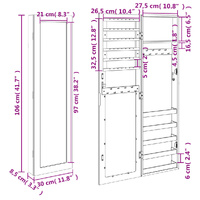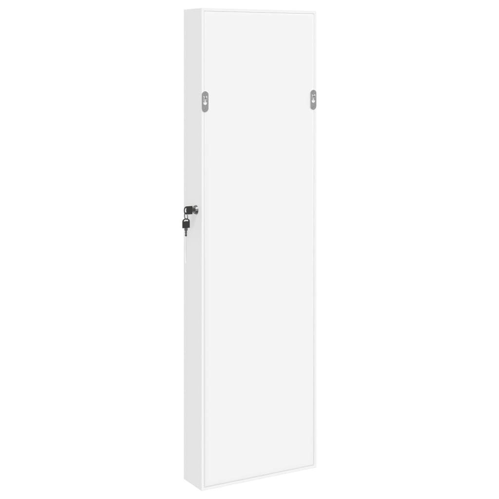 Keep your jewellery and perfumes discreetly and elegantly stored away with this stylish mirror jewellery cabinet! Durable material: The engineered wood is of exceptional quality with smooth surface and also features strength, stability and resistance to moisture. Made of engineered wood, the jewellery cabinet is easy to clean with a damp cloth. Ample storage space: The storage mirror offers plenty of hooks, hangers and shelves to keep your jewellery neatly organised and within reach.Practical mirror: With a full-length mirror, this jewellery organiser is great for getting ready and applying make-up.Considerate protection: The jewellery storage has a lockable door and comes with 2 keys to ensure the safety of your items. Also, the soft fabric cover inside not only adds elegance but also protects your beloved jewellery from scratches.Space-saving design: Hang the mirror jewellery box over the door with the included hooks or mount it on the wall to save floor space. Good to know:Screws for wall mounting are included.