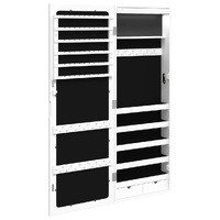 Keep your jewellery and perfumes discreetly and elegantly stored away with this stylish mirror jewellery cabinet with LED lights! Durable material: The engineered wood is of exceptional quality with smooth surface and also features strength, stability and resistance to moisture. Made of engineered wood, the jewellery cabinet is easy to clean with a damp cloth.Ample storage space: The storage mirror offers 2 drawers and plenty of hooks, hangers and shelves to keep your jewellery neatly organised and within reach.Practical mirror: With a full-length mirror, this jewellery organiser is great for getting ready and applying make-up.Considerate protection: The jewellery storage has a lockable door and comes with 2 keys to ensure the safety of your items. Also, the soft fabric cover inside not only adds elegance but also protects your beloved jewellery from scratches.Convenient LED lights: Located at the top inside, the LED lights automatically turn on when the door opens to help you find your jewellery.Space-saving design: Hang the mirror jewellery box over the door with the included hooks or mount it on the wall to save floor space. Good to know:Screws for wall mounting are included.3 AA batteries are required but not included in the delivery.