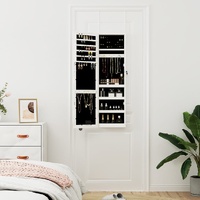 Keep your jewellery and perfumes discreetly and elegantly stored away with this stylish mirror jewellery cabinet with LED lights! Durable material: The engineered wood is of exceptional quality with smooth surface and also features strength, stability and resistance to moisture. Made of engineered wood, the jewellery cabinet is easy to clean with a damp cloth. Ample storage space: The storage mirror offers plenty of hooks, hangers and shelves to keep your jewellery neatly organised and within reach.Practical mirror: With a full-length mirror, this jewellery organiser is great for getting ready and applying make-up.Considerate protection: The jewellery storage has a lockable door and comes with 2 keys to ensure the safety of your items. Also, the soft fabric cover inside not only adds elegance but also protects your beloved jewellery from scratches.Bright LED lights: The mirror is surrounded by LED lights that are controlled by on/off switch, which not only gives you a movie star feeling but also adds an extra touch to your room décor.Space-saving design: Hang the mirror jewellery box over the door with the included hooks or mount it on the wall to save floor space. Good to know:Screws for wall mounting are included.3 AA batteries are required but not included in the delivery.