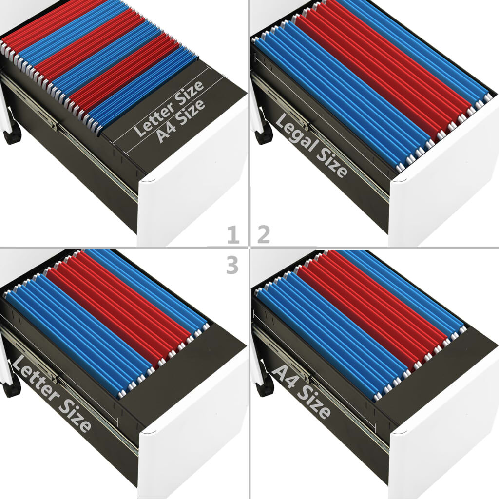This mobile file cabinet, with a modern design, is ideal for file storage. This office cabinet is made of steel, making it durable as well as easy to clean. With 3 drawers and 1 lock, this file cabinet allows you to neatly sort your files into different categories and keep files safe. Each drawer is equipped with 1 removable hanging bar, which can be freely combined to store letter size, legal size and A4 hanging file folder. The mobile caninet has a pencil tray, which can make your desktop more tidy. Drawers with 3 sections ballbearing runners ensure smooth opening and closing, even under increased load, these drawers can be fully extended. Additionally, the left and right corners of the cabinet are round. The file cabinet fits well under a desk and will suit any office decor thanks to its iconic design.