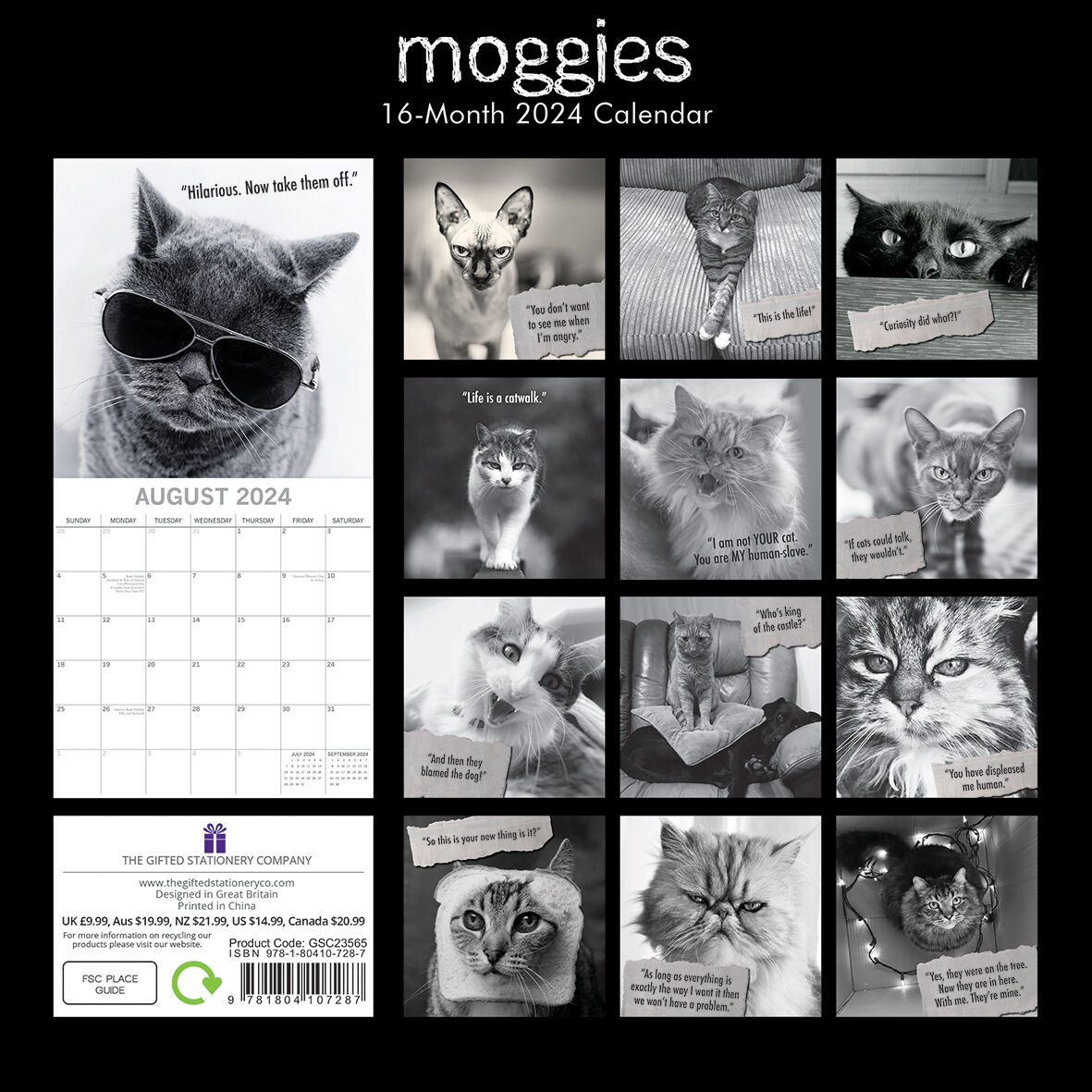 Dive into the quirky world of "Moggies" this 2024. Discover the playful and sometimes mischievous side of cats as they prance, lounge, and create mischief. A purrfect calendar for those who enjoy feline antics with a touch of humor. Brand New Calendar with Beautifully design, Sealed in Original Packaging, each calendar includes a large grid running from Sunday to Saturday. Publisher: The Gifted Stationery Co. Dimensions: 30cm (w) x 30cm (h) closed; 30cm (w) x 60cm (h) opened Time Span: 16 months (January to December 2024 monthly, September to December 2023 on-a-page) 2024 Square Wall Calendar featuring beautiful colour photographed images for every month of the year. Like most Wall calendars, this one comes with: