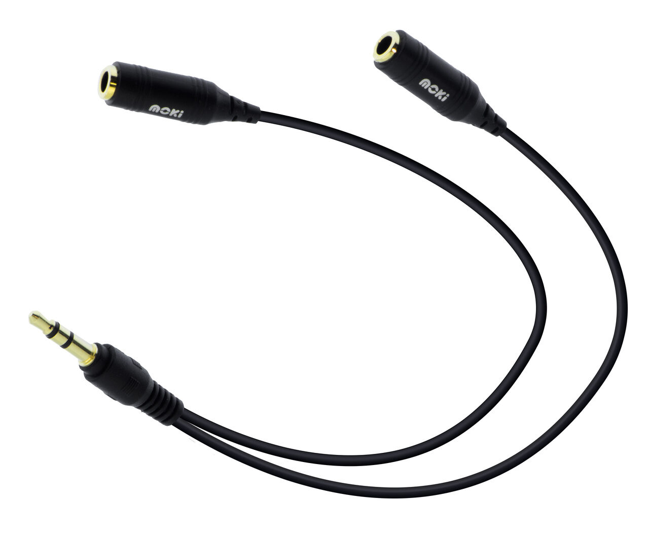 Moki Splitter Cables allow you to share your music on two headphones or speakers connected to just one audio player. Moki splitter cables work with all smartphones, tablets, mp3 players, portable DVD handheld game consoles.