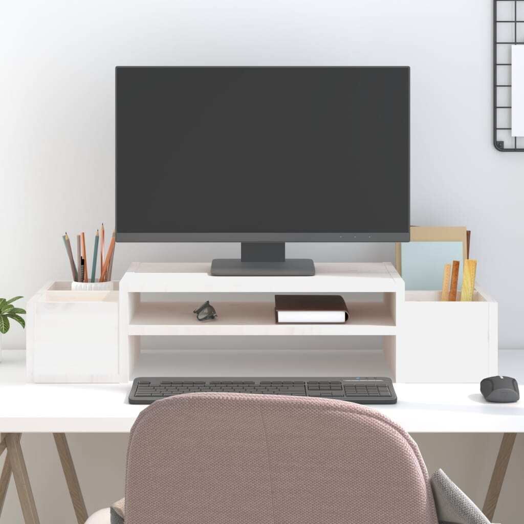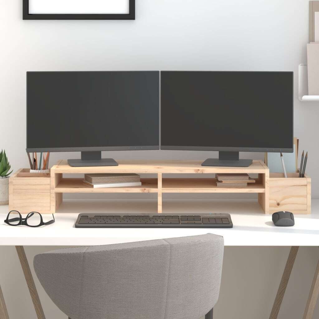 $41.35This classic wooden monitor stand featuring a minimalist design adds a beautiful touch to your current living space. Solid pinewood: Solid pine wood is a beautiful natural material. Pine wood has a straight grain, and the knots give the material its signature, rustic look.Stable frame: The wooden frame of this computer stand ensures sturdiness and stability.Storage space: The 4 storage slots on the side of the computer monitor stand and the space underneath the monitor riser allow you to store keyboard, DVD player, gaming console, receivers, media carriers, notebooks, pens, and similar items.Stress-reducing function: This keyboard stand can be used as a riser for your desktop monitor and other multimedia devices. Raising your screen will reduce the strain on your neck and back. Note:Each product comes with an assembly manual in the box for easy assembly.