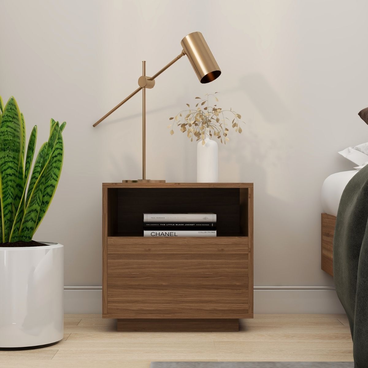 We believe furniture should look good but also be capable of handling your busy lifestyle. That's why we chose an eco-friendly engineer wood, as elegant as it is sturdy and durable, to craft our Nook bedside table