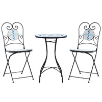 Enjoy a cup of coffee or have a chat with your family and friends in the garden, backyard, or on the balcony with this mosaic bistro set! Stable and easy-to-clean tabletop: This garden table has a ceramic top that is sturdy, durable, and easy to clean with a damp cloth.Robust and stable frame: The powder-coated iron frame ensures that the bistro table and chairs are strong and stable for daily indoor or outdoor use.Foldable design: The bistro dining chair can also be folded to save space when not in use.Mosaic design: The balcony set helps create a Mediterranean atmosphere in your indoor or outdoor settings with its mosaic design. Good to know:To make sure your outdoor furniture stays beautiful, we recommend protecting it with a waterproof cover.